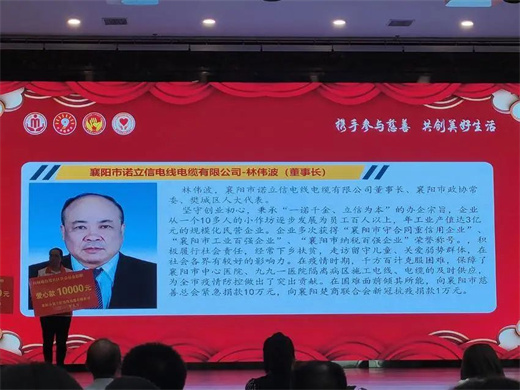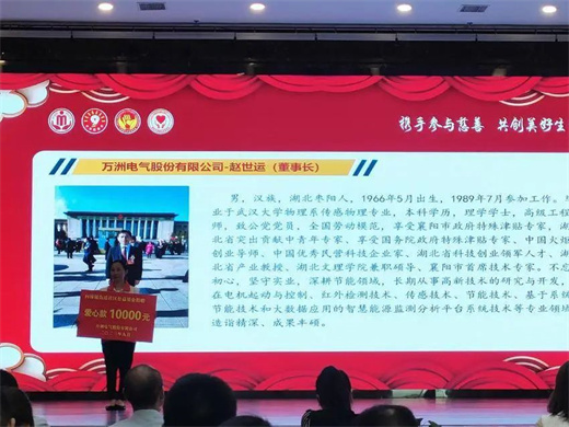活動(dòng)中,萬洲電氣股份有限公司捐贈(zèng)10000元,襄陽市諾立信電線電纜有限公司捐贈(zèng)10000元,襄陽世陽電機(jī)有限公司捐贈(zèng)5000元。