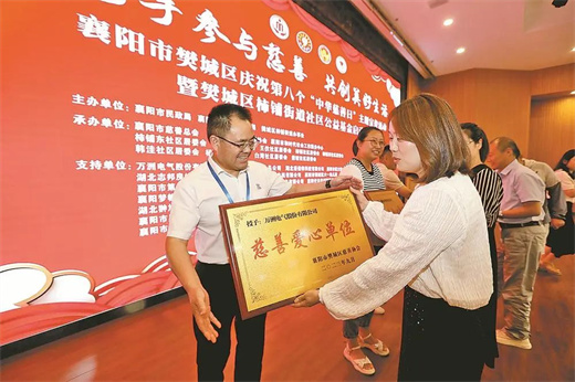 9月5日是我國第八個“中華慈善日”。當日,由樊城區(qū)民政局等單位主辦的“攜手參與慈善 共創(chuàng)美好生活”2023年樊城區(qū)柿鋪街道“中華慈善日”宣傳活動暨“樊城區(qū)柿鋪街道社區(qū)公益基金”啟動儀式舉行。活動現(xiàn)場,區(qū)民政局向柿鋪街道授予“柿鋪街道·社區(qū)公益基金”牌匾,萬洲電氣股份有限公司、湖北諾伯特科技有限公司等公司捐贈1萬元以上的愛心基金。