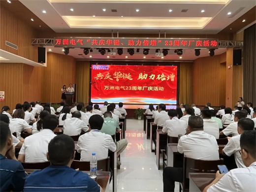 載懽載笑獻(xiàn)賀禮,歡聚一堂慶華誕。9月7日下午,在萬洲電氣一樓多功能廳,伴隨著莊嚴(yán)的國歌聲,萬洲電氣23周年廠慶活動(dòng)拉開帷幕。萬洲電氣黨委書記、副總經(jīng)理李明輝、副總經(jīng)理包群英、市場營銷中心副總經(jīng)理李峰、云川光電總經(jīng)理趙邦國等領(lǐng)導(dǎo)出席廠慶活動(dòng)。萬洲電氣、云川光電、襄陽工廠、萬洲機(jī)械全體在家員工500余人歡聚一堂,共慶萬洲電氣23周年華誕。
