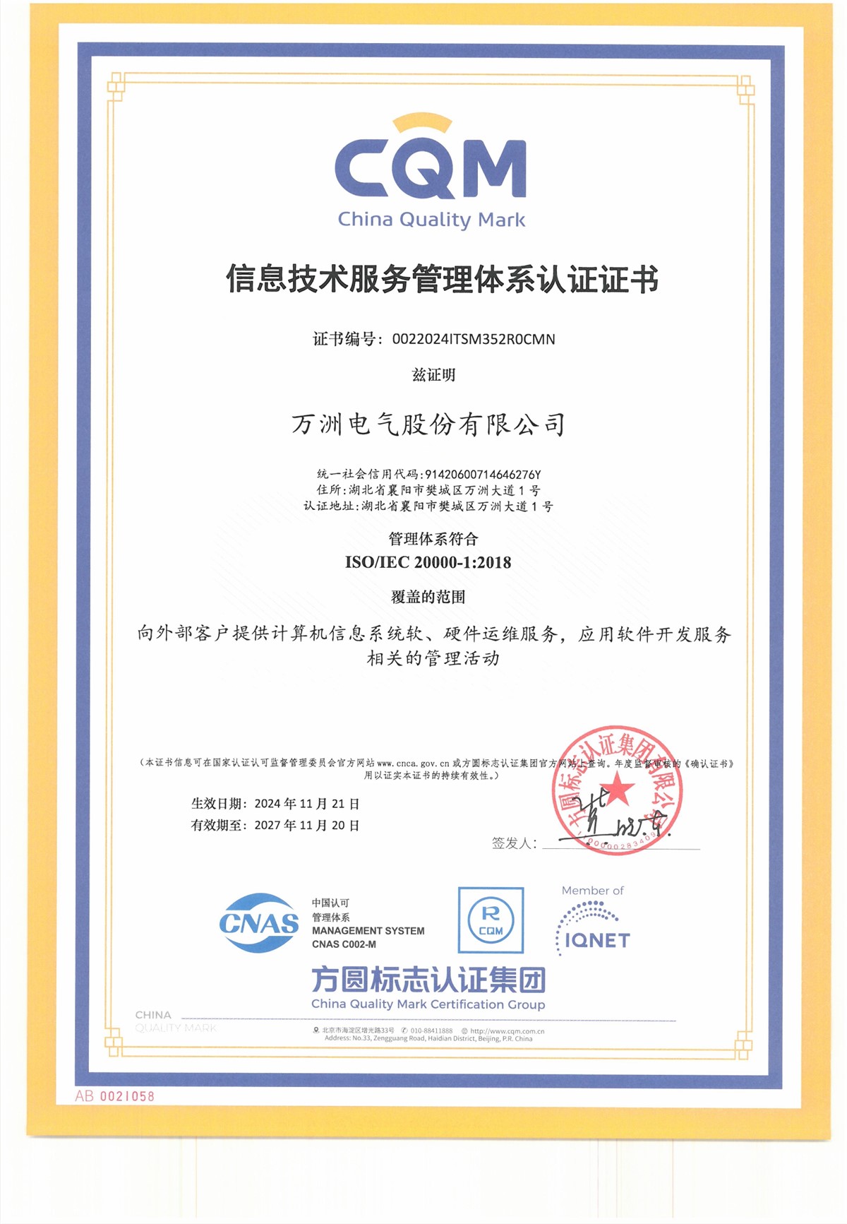 近日,萬(wàn)洲電氣成功取得《信息技術(shù)服務(wù)管理體系》和《信息安全管理體系》兩項(xiàng)認(rèn)證證書(shū)。