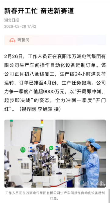 2月26日,工作人員正在襄陽市萬洲電氣集團(tuán)有限公司生產(chǎn)車間操作自動化設(shè)備趕制訂單。該公司正月初八全線復(fù)工,生產(chǎn)線24小時滿負(fù)荷運轉(zhuǎn),訂單已排至4月份,生產(chǎn)任務(wù)飽滿。公司力爭一季度產(chǎn)值超9000萬元,以“開局即沖刺、起步即決戰(zhàn)”的姿態(tài),全力沖刺一季度“開門紅”。