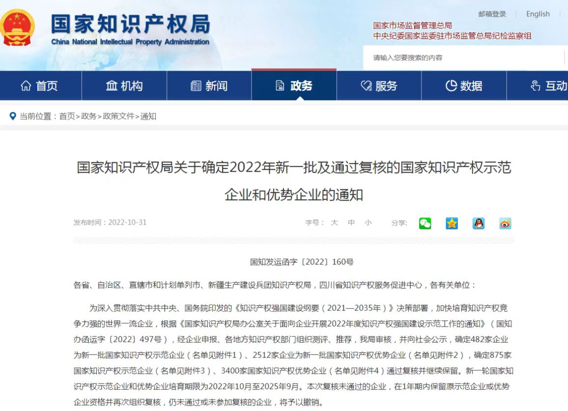 11月2日,從國家知識產權局傳來喜訊,萬洲電氣股份有限公司上榜2022年新確定的國家知識產權優勢企業名單。