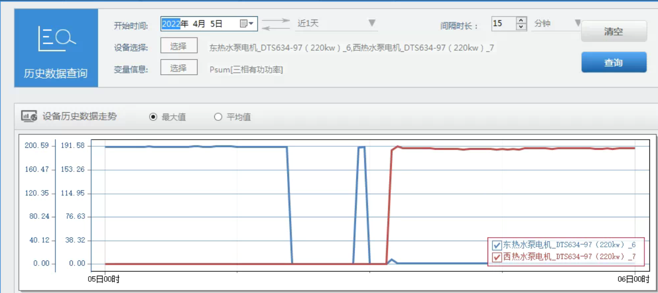 2、熱水泵運(yùn)行狀態(tài)優(yōu)化節(jié)能。現(xiàn)場(chǎng)兩臺(tái)熱水泵,額定功率均為220kW,采用一用一備方式運(yùn)行。用戶通過(guò)系統(tǒng)實(shí)時(shí)數(shù)據(jù)功能發(fā)現(xiàn):綜合泵房東熱水泵和西熱水泵運(yùn)行存在差異,東熱水泵運(yùn)行負(fù)荷穩(wěn)定在190kW,西熱水泵運(yùn)行負(fù)荷穩(wěn)定在200kW。發(fā)現(xiàn)問(wèn)題后對(duì)西熱水泵進(jìn)行了檢修,檢修完畢后西熱水泵功率降低了10kW,每年可以節(jié)約電費(fèi)2.9萬(wàn)元。