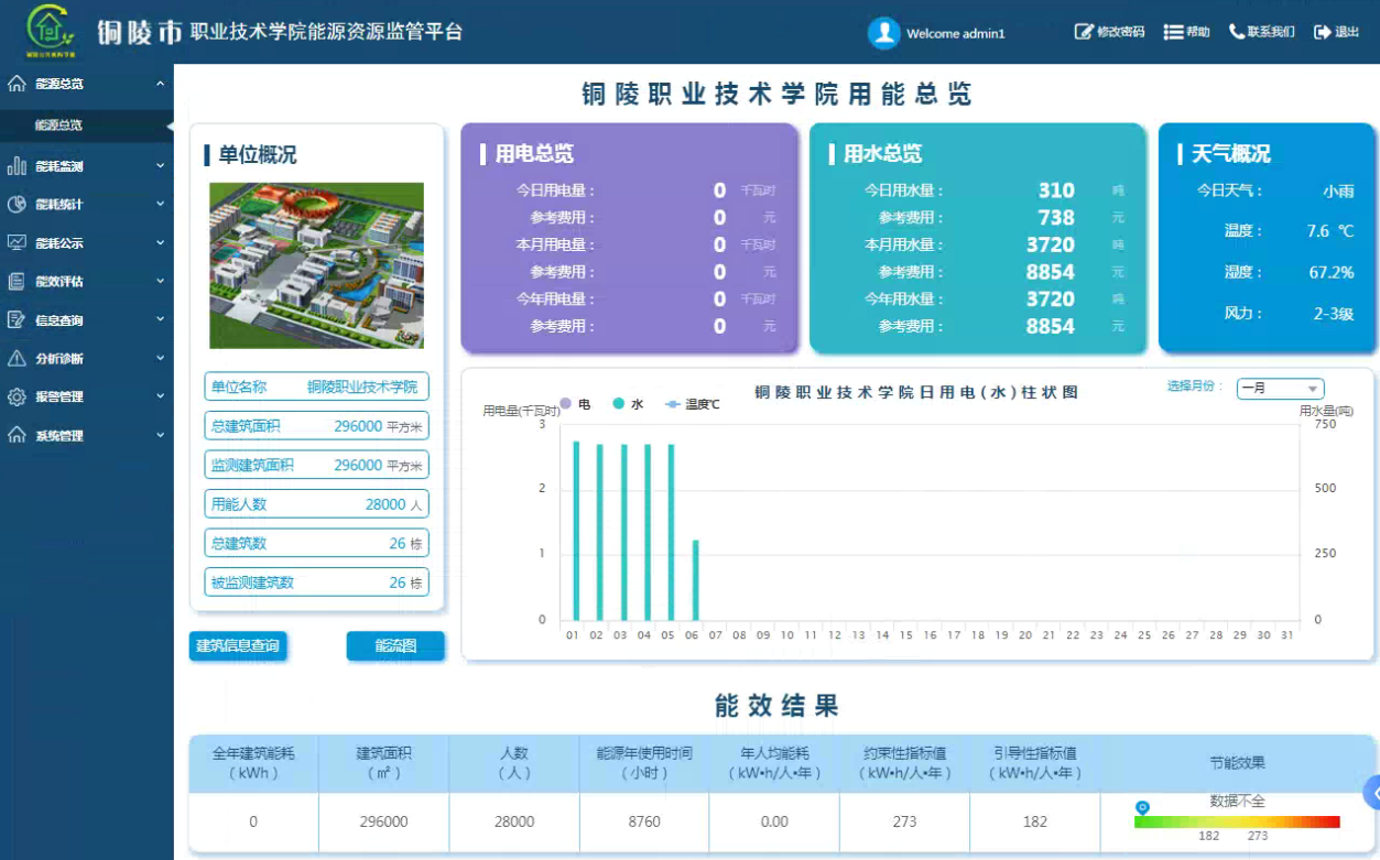 安徽某職業(yè)技術(shù)學(xué)院總建筑面積約21萬平方米,主要建筑為6棟教學(xué)樓、14棟宿舍、實(shí)訓(xùn)樓、圖書館、食堂、大學(xué)生活動中心等。其中圖書館地下一層為車庫。學(xué)院主要建筑均建設(shè)于2011年~2012年,維護(hù)情況較好。建筑主要能耗形式為水、電;主要用能設(shè)備為照明系統(tǒng)、各類空調(diào)、辦公系統(tǒng)、教學(xué)設(shè)備、公共設(shè)施等。2021年2月學(xué)校部署了一套WBEAS建筑智能優(yōu)化節(jié)能系統(tǒng)。