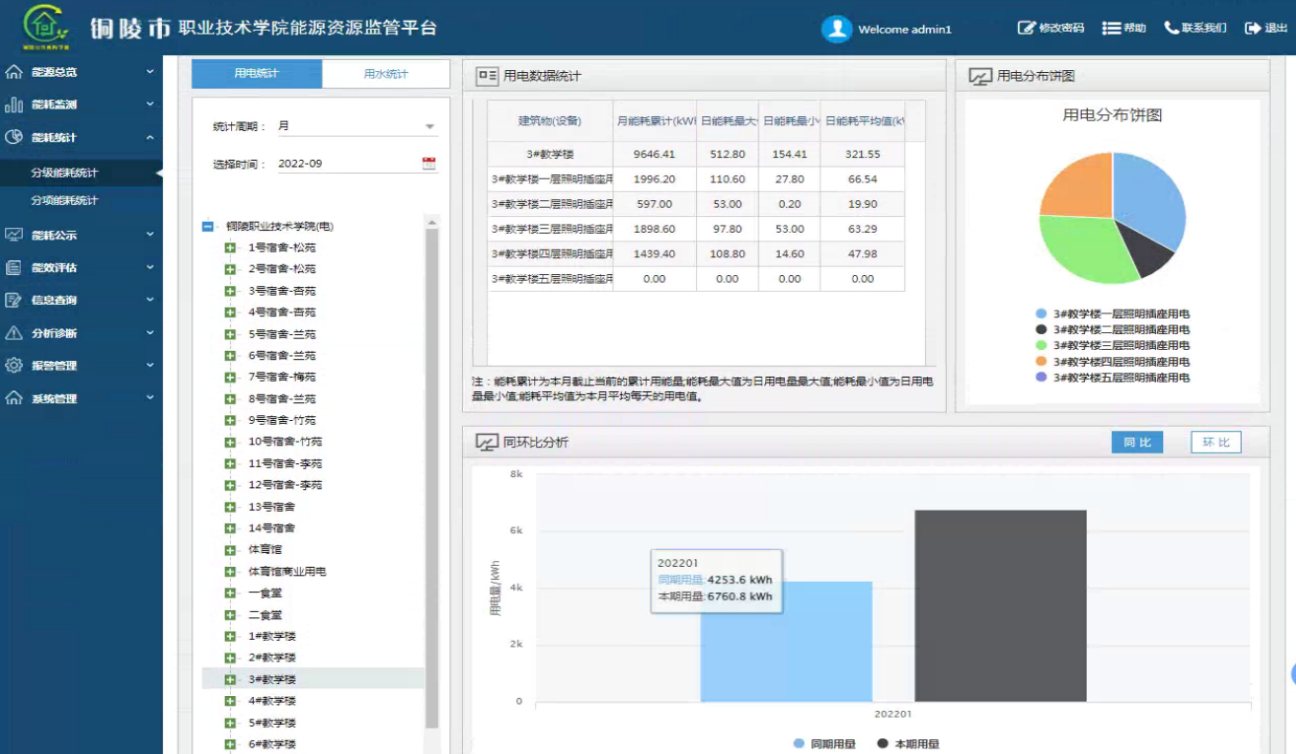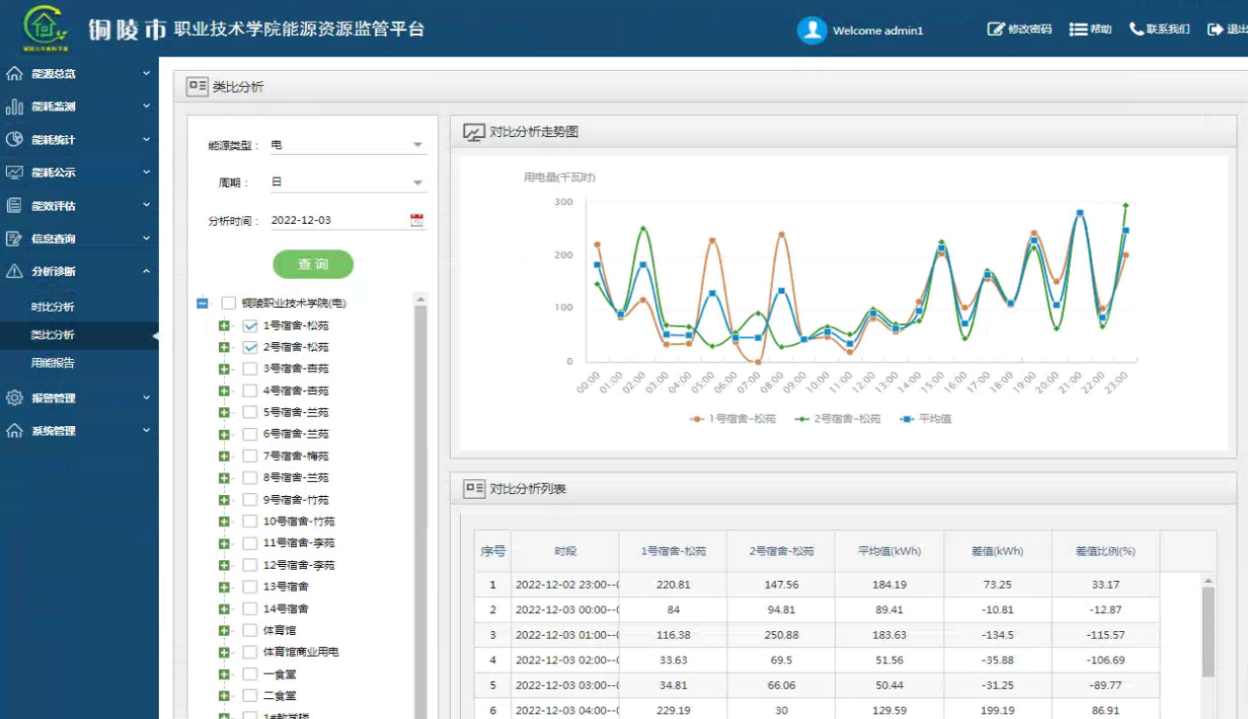 2、優(yōu)化宿舍用電管理措施,減少能源浪費(fèi)。學(xué)校宿舍樓一共有14棟,通過歷史數(shù)據(jù)查詢功能發(fā)現(xiàn)每天晚上除5號宿舍和9號宿舍在23點(diǎn)之后照明用電量有明顯的下降外,其他的宿舍樓照明用電持續(xù)運(yùn)行到凌晨1點(diǎn)才有下降的趨勢,并未進(jìn)行管控,學(xué)校發(fā)現(xiàn)該問題后,通過對宿舍樓進(jìn)行統(tǒng)一照明用電管理,優(yōu)化宿舍用電管理措施,避免能源浪費(fèi),每年學(xué)校宿舍樓節(jié)約3.29萬元。